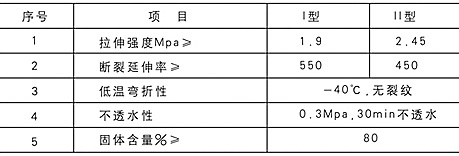| 产品介绍 | | 本产品是一种反应固化成膜的高分子防水涂料。它是以聚醚多元醇、异氰酸酯为主要原料。配以混合潜固剂等各种助剂,用特殊工艺经高温脱水、聚合反应配制而成,使用时涂覆于防水基层,通过预聚体中的-NCO端基于空气中的湿气进行化学反应。在基层表面形成柔软、无接缝的橡胶状防水膜。 | | 产品特点 | · 环保型产品,施工方便,适用范围广。对复杂部位施工具有明显优越性。 · 固化后形成无接缝,完整的弹性防水层,提高了建筑工程的防水抗渗能力,是卷材类产品无法达到的。 · 涂膜具有较高的强度和延伸性,对基层开裂或伸缩适应性强。 · 维修简便,只须对损坏部位局部维修,仍可达到原有的防水效果。 | | 主要性能指标 |  | | 施工规则及注意事项 | · 基层要求平整,坚固,不起砂,凹陷处用砂浆找平。 · 使用前先搅拌均匀,桶内沉淀为正常现象,搅拌均匀后即可使用。 · 涂刷时将搅拌好的科倒在基层上,用刮板均匀摊开,每遍涂层应在0.5毫米以下,根据要求决定施工遍数。 · 沥青溶剂型涂料每遍涂刷厚度一定要控制在0.5毫米以内,否则表面起膜后下面溶剂挥发缓慢,会有粘手现象,如遇此种情况,可在表面撒一层粉料,擦拭后再进行下一遍施工。 |